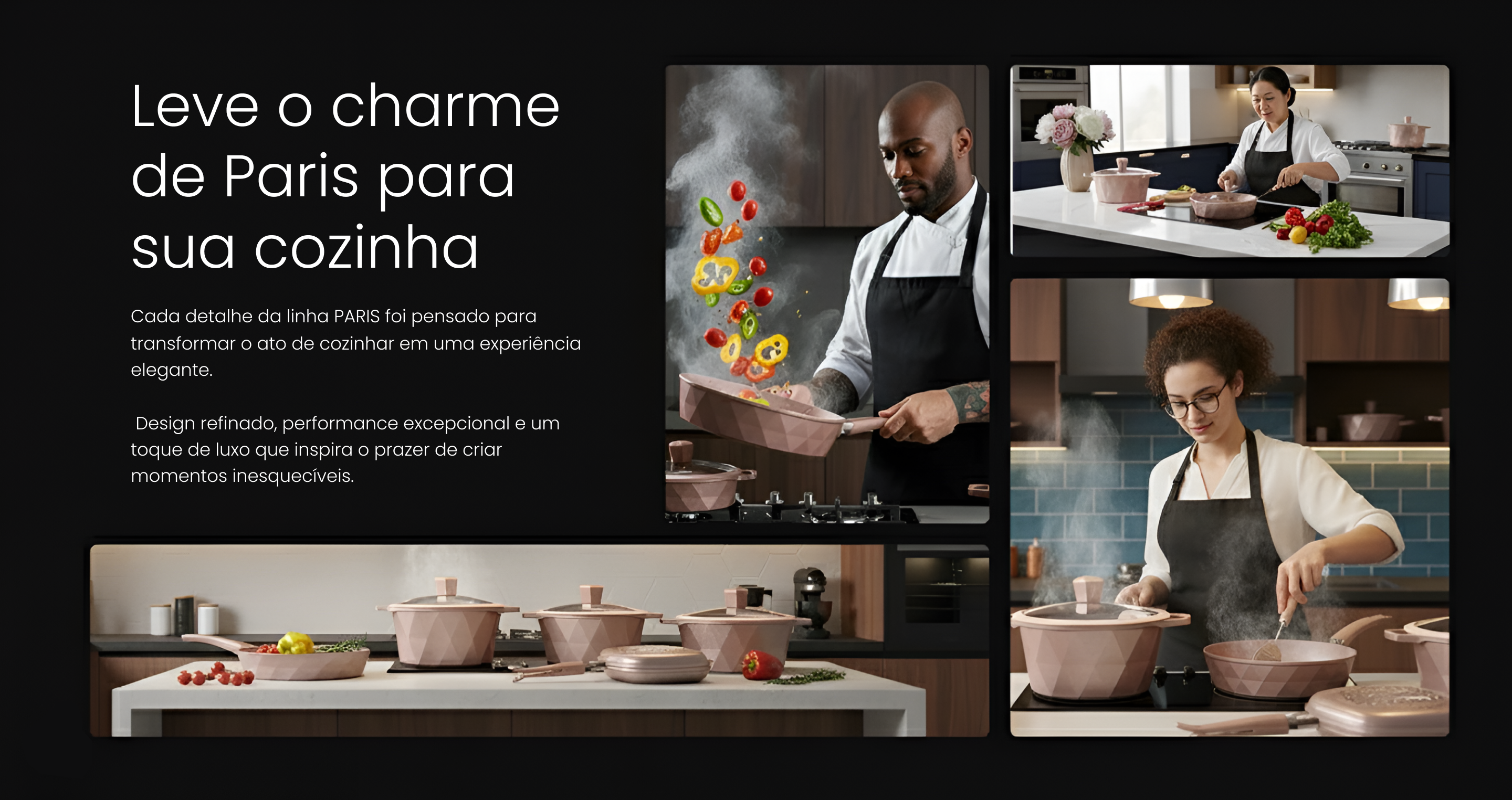 A cozinha é onde histórias começam, onde aromas despertam lembranças e onde cada detalhe importa. A Linha Paris foi criada para transformar a rotina em ritual, com peças que unem design sofisticado, desempenho impecável e um toque de charme francês.